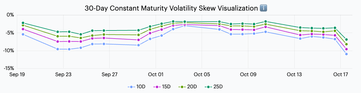 Meanwhile, as shown by a visualization of CME Bitcoin’s 30-day constant maturity skew, the 10-delta to 25-delta skew is currently indicated -15% to -10%.