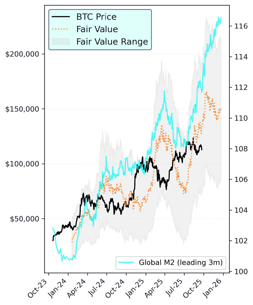 Within that section, Selby and Pilipczuk unveil a “proprietary fair value (FV) framework for Bitcoin.” It’s based on a regression of BTC (proxy: CME CF Bitcoin Reference Rate) against CF Benchmarks’ internal Global M2 money supply index, “where changes in M2 lead Bitcoin by approximately three months.”