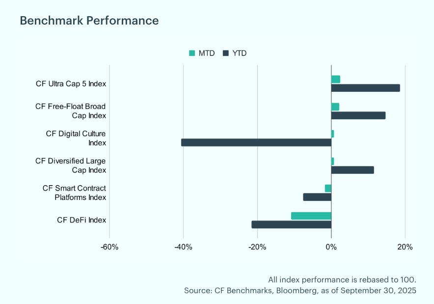 Mega-Cap Strength Returns: Digital asset performance returned to favoring larger-cap tokens again, with the CF Ultra Cap 5 Index leading September's gains, rising 2.41% for the month and lifting its year-to-date return to +18.62%. The CF Free-Float Broad Cap Index added 2.17% (YTD +14.72%), and the CF Diversified Large Cap Index rose 0.70% (YTD +11.60%), while the CF Digital Culture Index edged up 0.78% (YTD −40.59%). Higher-beta cohorts lagged: the CF Smart Contract Platforms Index fell 1.75% (YTD −7.59%), and the CF DeFi Index declined 10.89% (YTD −21.55%). Overall, September favored liquid mega-caps, while DeFi and smart contract names underperformed.