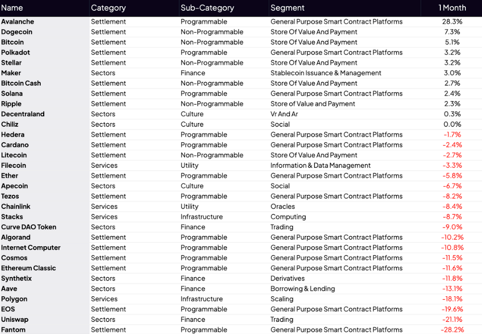 Individual Movers: Avalanche surged 28.3% in September, driven by institutional initiatives including the launch of treasury vehicles to accumulate AVAX. Dogecoin jumped 7.3%, driven by renewed memecoin momentum and optimism around the ETF launch in late September. Fantom slumped 28.2%, weighed down by weak fundamentals and capital outflows. Uniswap fell 21.1%, despite ongoing protocol upgrades and expansion into new chains.