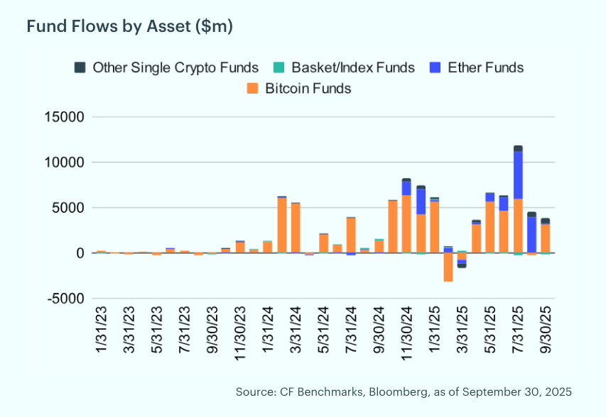 September 2025 bucked its historical trend of negative price performance, supported by a series of regulatory and macro catalysts. The Fed delivered its first rate cut of the year, reducing rates by 25 bps to 4.00–4.25% and citing rising labor market risks, though forward guidance remained cautious and less definitive than markets had anticipated. The SEC approved generic listing standards for commodity-based trust shares, streamlining the path to list crypto ETPs beyond BTC and ETH. CME announced options on Solana and XRP futures for October, extending institutional-grade positioning and hedging tools. Despite choppy price action, fund flows remained robust at $3.8B for the month, with investor appetite picking up after the FOMC and strong focus on Bitcoin.