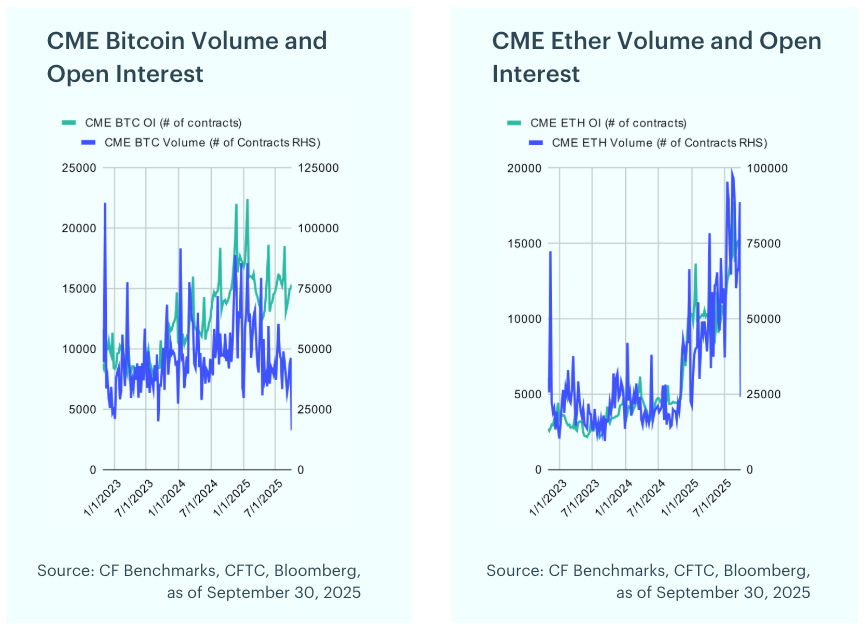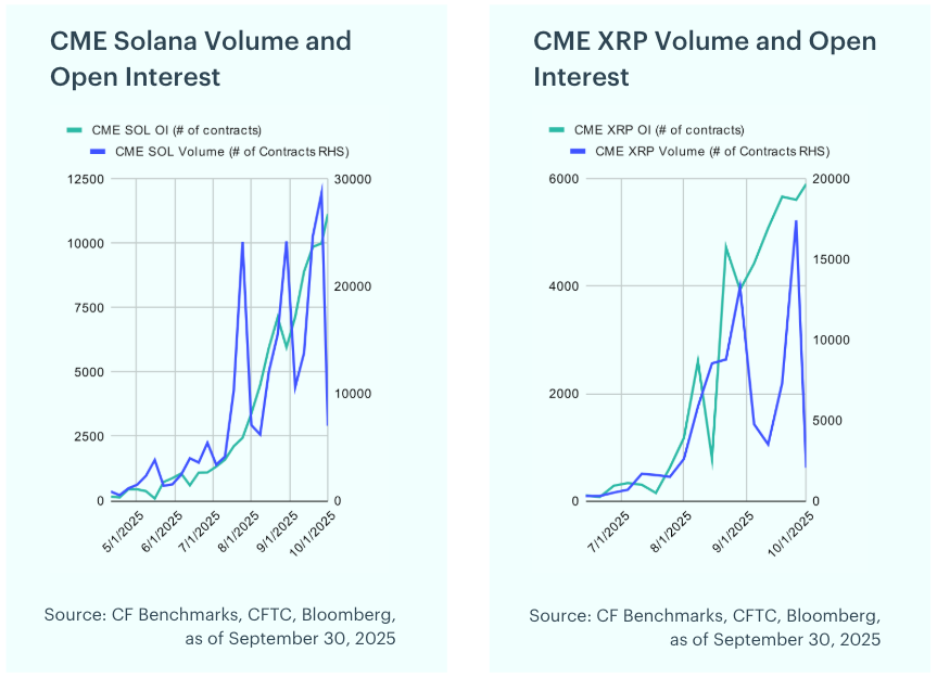 SOL and XRP Futures Lead Open Interest Growth: Bitcoin futures saw strong growth in September, with open interest rising 17.5% from 13,501 to 15,336 contracts. Ether futures also gained momentum, with open interest climbing 13.2% to a record 15,607 contracts, supported by robust trading activity that peaked at 88,733 contracts at month-end. Meanwhile, Solana and XRP futures posted substantial expansion amid heightened investor interest: Solana’s open interest surged 86.6% to 11,146 contracts, with volumes exceeding 24,000 contracts, while XRP’s open interest jumped 50.1% to 5,901 contracts, accompanied by a material increase in trading volumes.