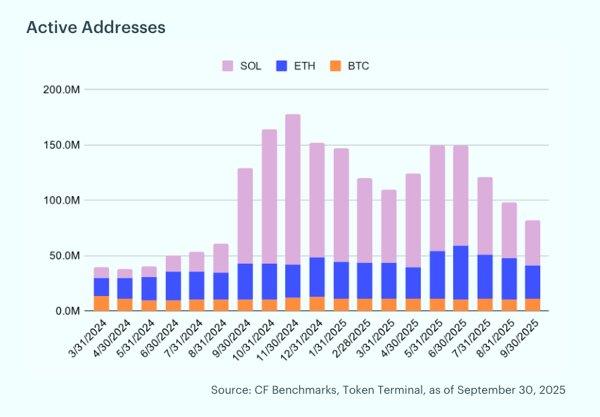On-Chain Activity Moderates; Bitcoin Holds Steady: Bitcoin’s active addresses in September grew slightly to 10.7 million from 10.5 million in August (1.6%), signaling steady network activity. Ethereum saw a sharp pullback, with active addresses falling from 37.3 million to 30.6 million (-17.8%), reflecting weaker on-chain engagement. Solana experienced the steepest drop, as active addresses declined from 50.0 million to 40.9 million (-18.2%).