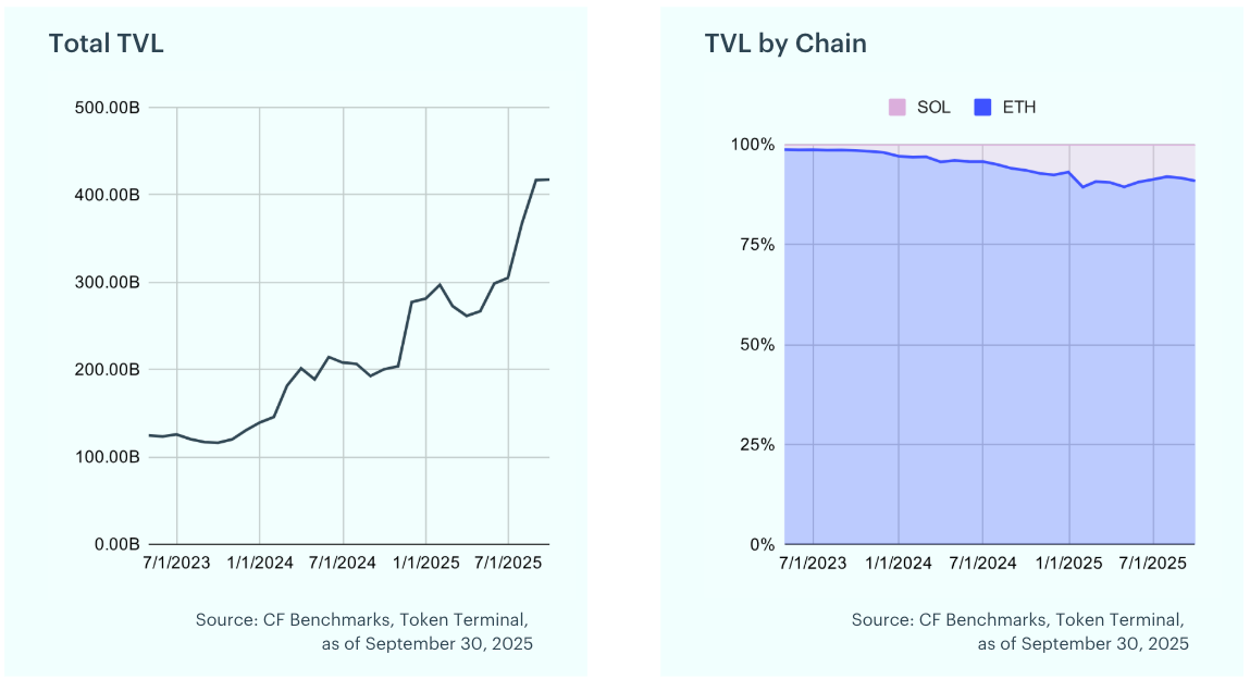 DeFi Growth Pauses at $417B: Total Value Locked (TVL) in DeFi measures the total assets deposited in decentralized finance protocols, expressed in USD. It is a key indicator of the health and growth of the DeFi ecosystem. Over the past month, TVL in DeFi protocols rose just 0.1%, reaching approximately $417 billion. Growth stalled as Ether and Solana pulled back following their recent rally.