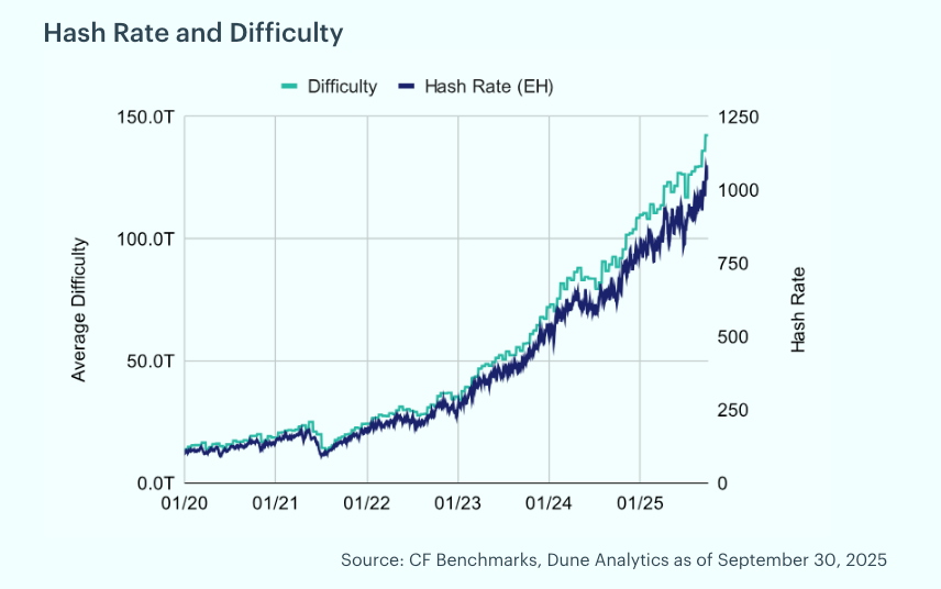 Hash Rate Reaches Record Levels: Bitcoin’s hash rate grew significantly in September, rising 9.7% to 1050 exahashes per second. Mining difficulty, which measures the computational effort required to mine a new block and adjusts to maintain consistent block creation times, increased by 5.1% after a period of faster block times in late September. The next difficulty adjustment, expected in the mid October, is currently projected to be a 0.8% increase.