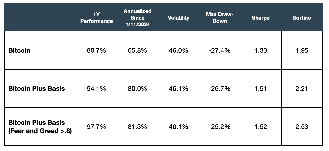 Over the full sample, the sentiment-gated approach (enter when Fear & Greed > 0.8; exit < 0.2) also delivers a higher annualized return since inception than the always-on strategy, with comparable—or better—risk-adjusted performance. This doesn’t overturn the early-sample dynamic: the opening stretch, marked by persistently elevated basis and strong momentum/“greed,” still favored staying fully invested. But as volatility moderated and basis expansions became less persistent, the tactical filter captured more of the upside while avoiding lower-quality carry, producing the higher all-time return in the updated figures.