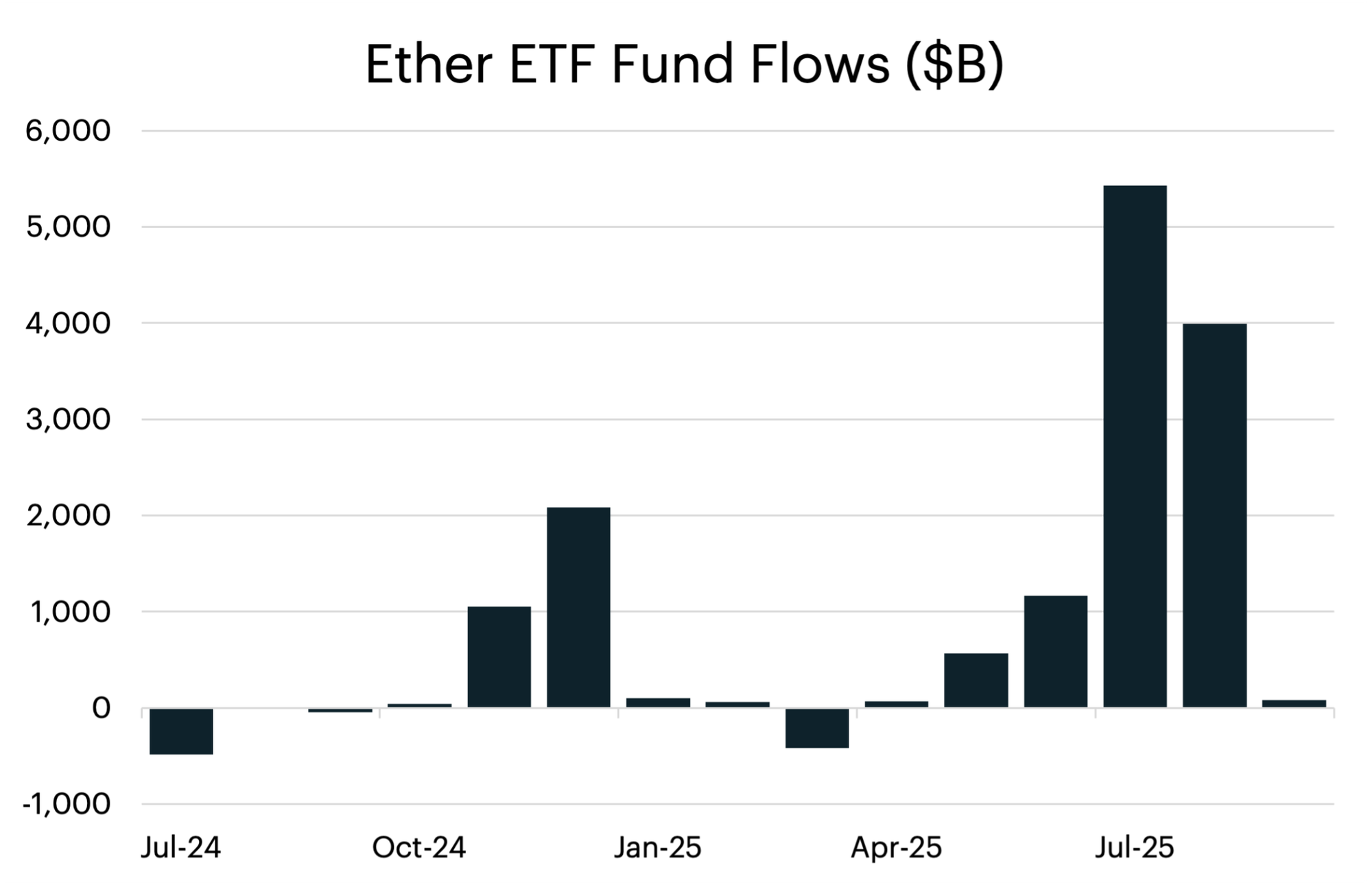 In Q2 2025, the Ether basis expanded north of 10% on multiple occasions, and we saw activity in both the spot ETF market and the futures market consistent with basis trading. Between April 2025 and August 2025, the net positioning by leveraged funds decreased from -6,000 contracts to -19,200. This coincided with roughly $11.2 billion in flows into spot Ether products over the same time period.