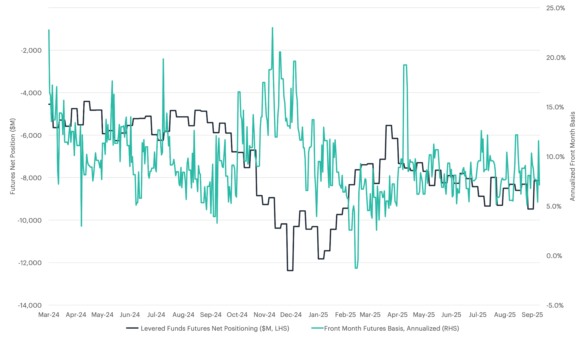 Figure 5: Levered Funds Positioning and Front Month Basis (Source: CF Benchmarks, Bloomberg as of 9/30/2025)