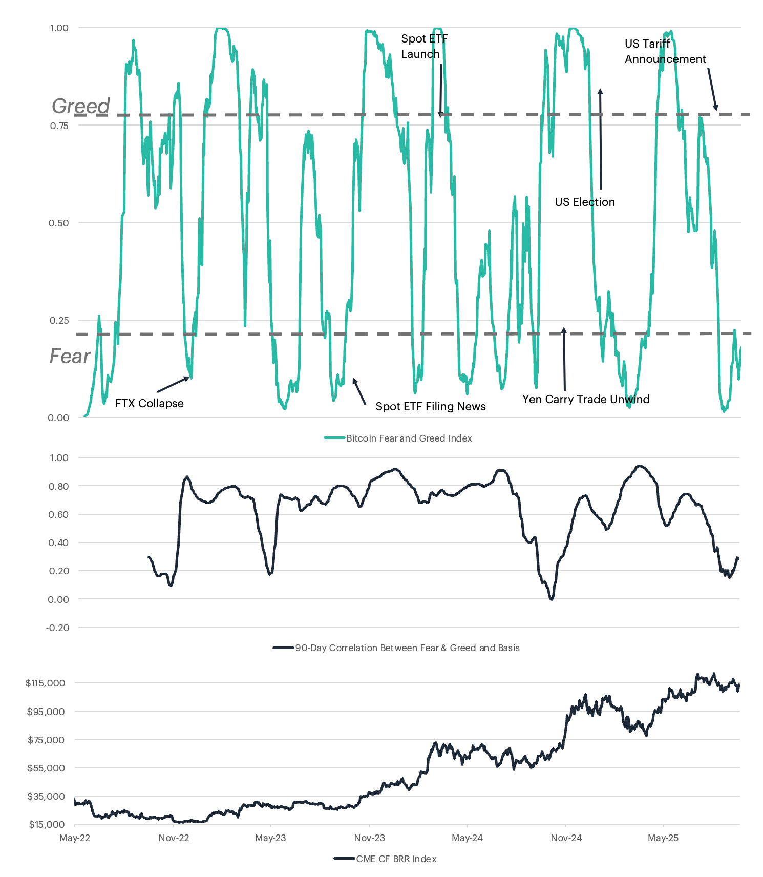 This momentum and sentiment-driven relationship, facilitated by aligned pricing benchmarks (e.g., CME CF BRR/BRRNY) and growing institutional adoption of crypto futures, marks a fundamental evolution in derivatives markets. Unlike traditional commodities, crypto’s 24/7 trading, extreme volatility, sentiment driven moves, and perpetual futures markets generate persistent feedback loops that amplify changes in the futures basis.