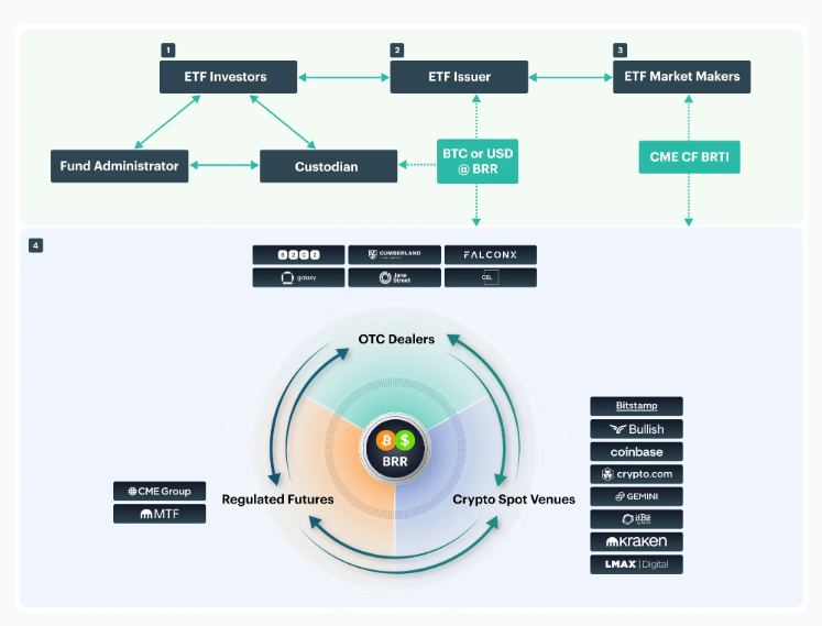 The CME CF BRR ties the spot markets to the regulated futures markets, creating a powerful liquidity complex that ETF issuers can rely on to ensure orderly creations and redemptions of ETF shares. Managers can buy and sell Bitcoin through major OTC dealers at the CME CF BRR with abundant liquidity, ensuring perfect tracking and eliminating NAV drift.