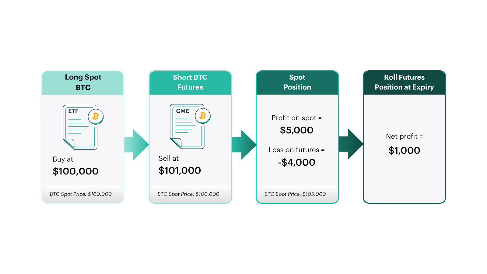 A trader could go long (buy) spot BTC via an ETF at $100,000 and simultaneously go short (sell) the CME BTC futures contract at $101,000 to lock in this $1,000 basis.