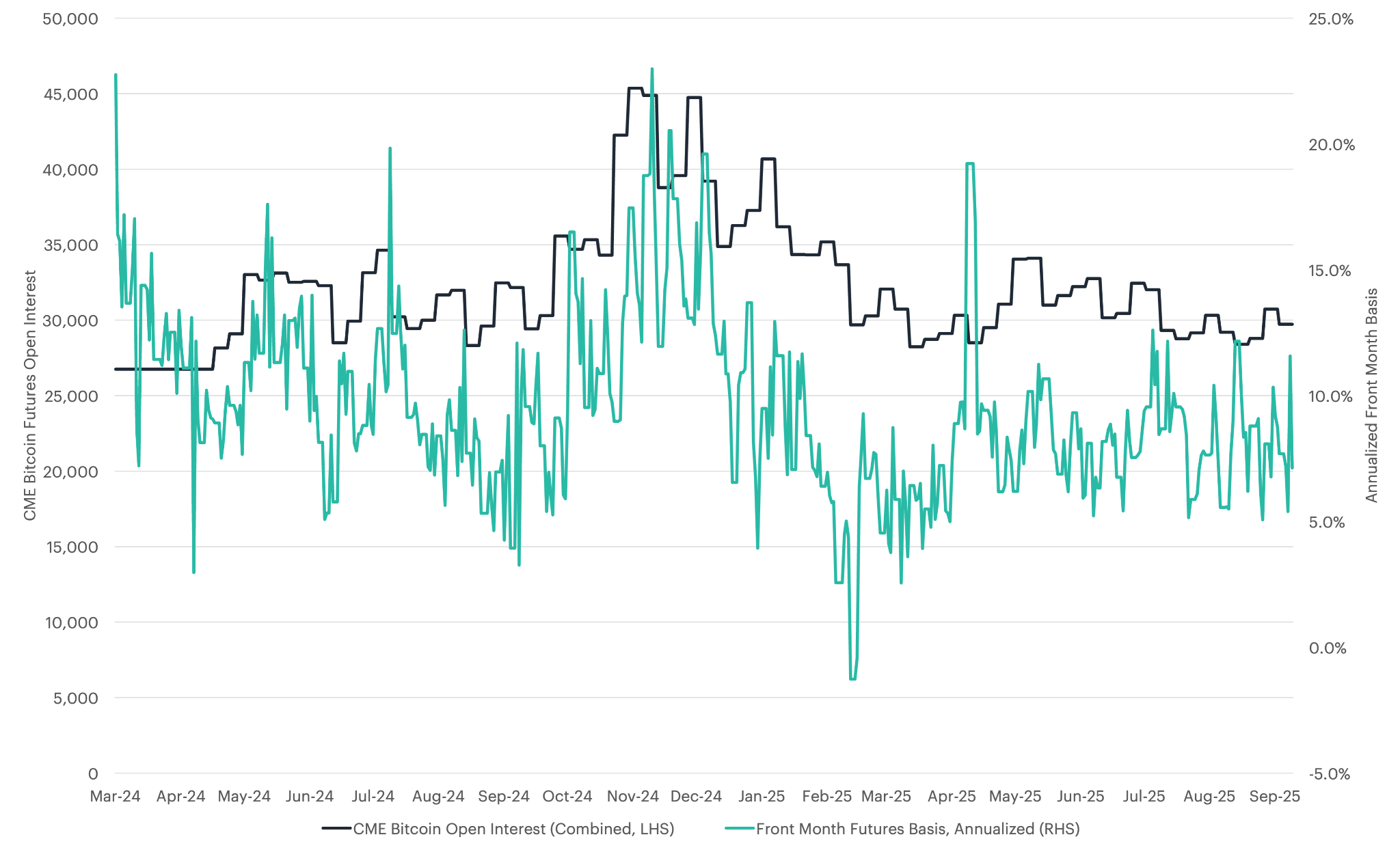 Figure 4: CME Open Interest and Front Month Basis (Source: CF Benchmarks, Bloomberg as of 9/30/2025)