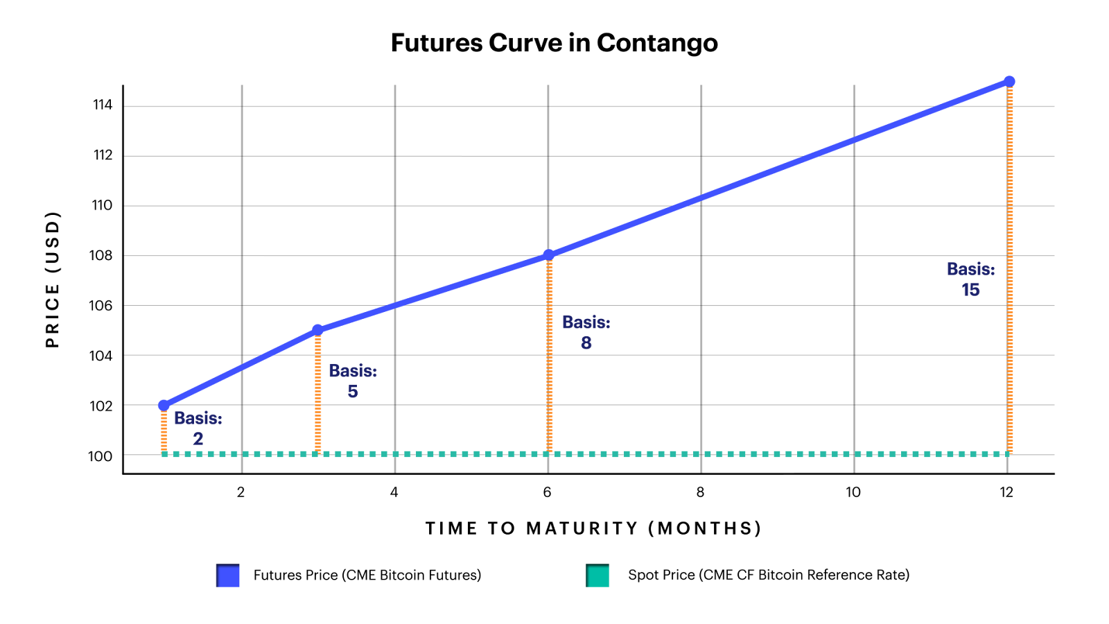 Figure 1 illustrates contango, where longer-term futures trade at higher prices than shorter-term contracts. In this example, the basis widens from 2 to 15 as the time to maturity extends from 1 to 12 months, highlighting the divergence between spot and futures prices and the resulting arbitrage opportunities for basis traders.