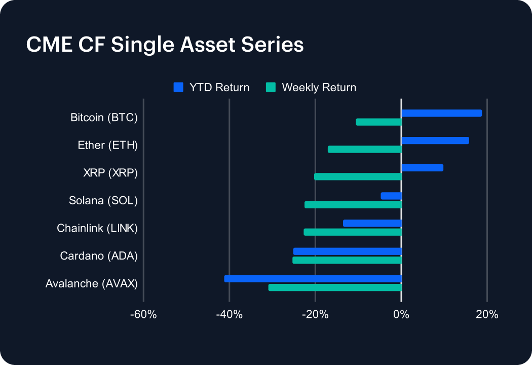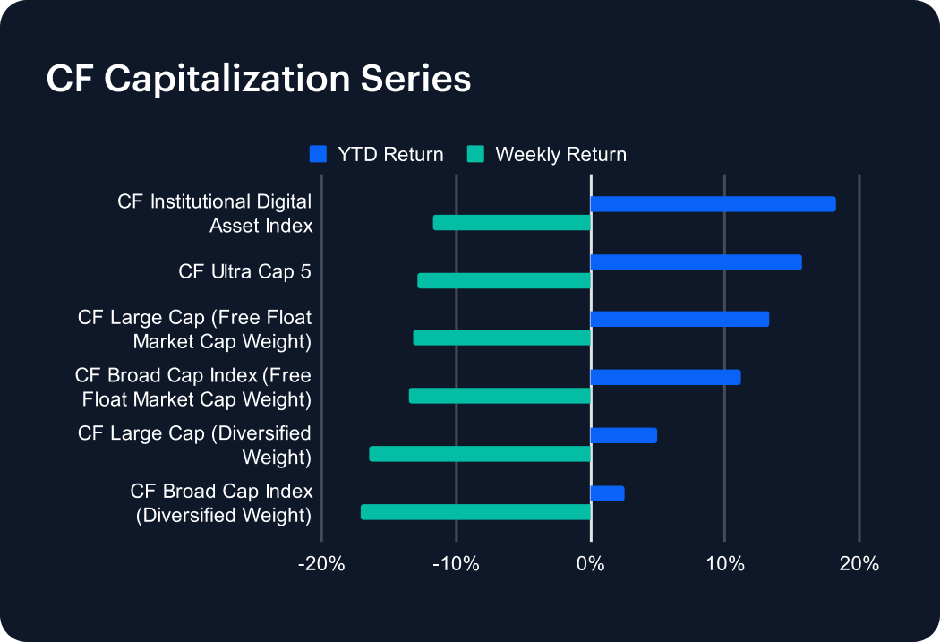 Moves were consistently lower across size tiers, reflecting some orderliness, to an extent, in the broad down move. The CF Broad Cap Index (Diversified Weight) fell −17.06%, CF Large Cap (Diversified Weight) was down −16.44%, CF Ultra Cap 5 lost −12.89%, and the CF Institutional Digital Asset Index moved −11.70% lower. Rank-ordering suggests deeper drawdowns further down the breadth stack, consistent with a liquidity-seeking de-risking. Note that Ultra Cap and Institutional cohorts outperformed on a relative basis.