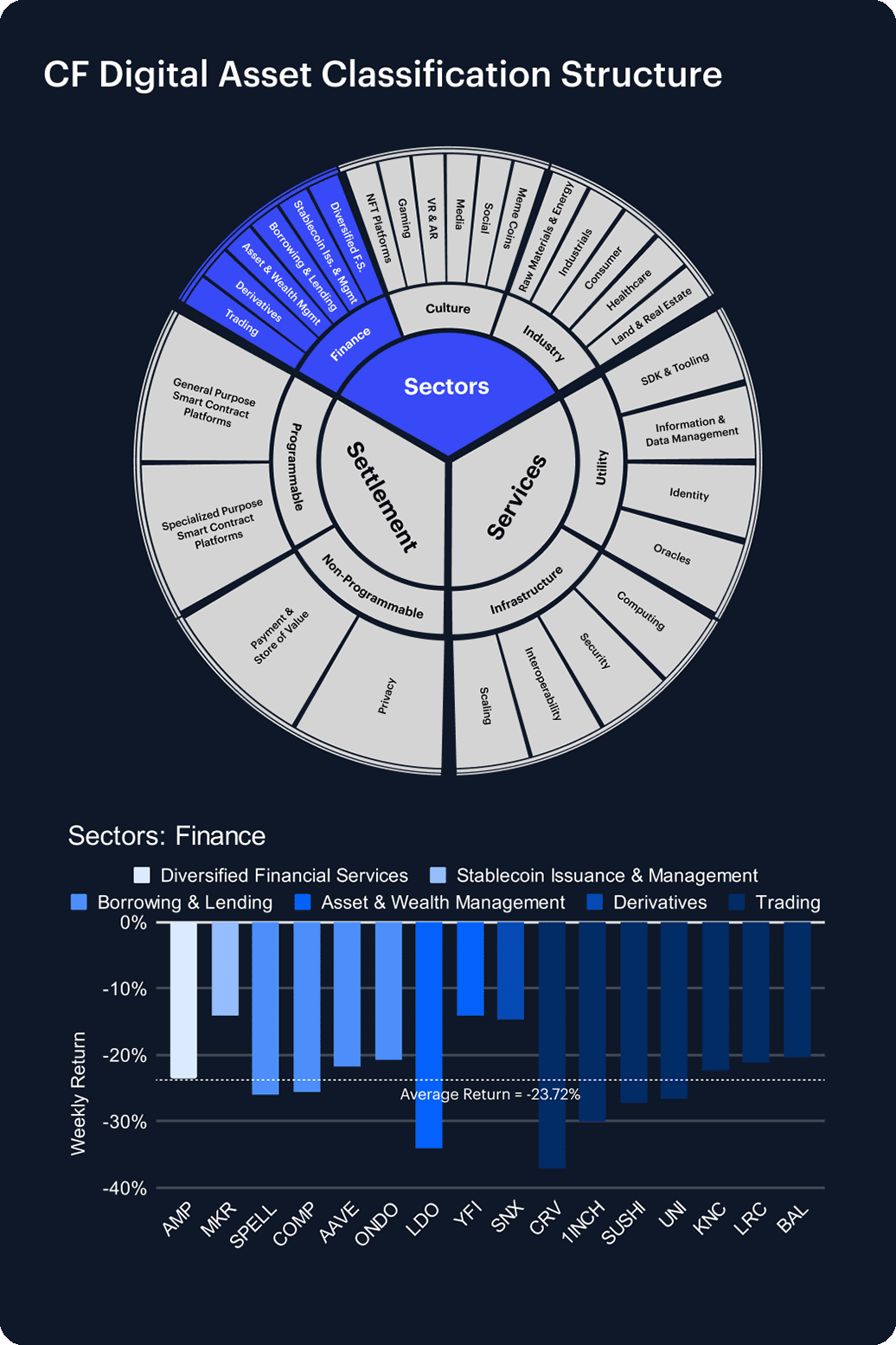 Through the CF Digital Asset Classification Structure (CF DACS) lens, performance was decisively lower week-on-week, albeit with dispersion across cohorts. Store of Value & Payment (Settlement) was the relative hold-out at −16.93% w/w, while Scaling (within the Infrastructure sub-category) printed down −27.39% and General Purpose Smart Contract Platforms retreated −26.22%. Sector cohorts weakened as Finance fell −23.72%, and the Utility Sub-Category fell −28.72%, led by the 34% slide of BICO, with Chainlink (CHAIN) losing -23%. Within Culture, Gaming underperformed particularly sharply with PRIME dropping −28.31%, and SuperVerse (SUPER) losing 32.87%. In short: a largely typical beta-led unwind, with Infrastructure and Services sliding in tandem while attention-leading segments fared the worst.