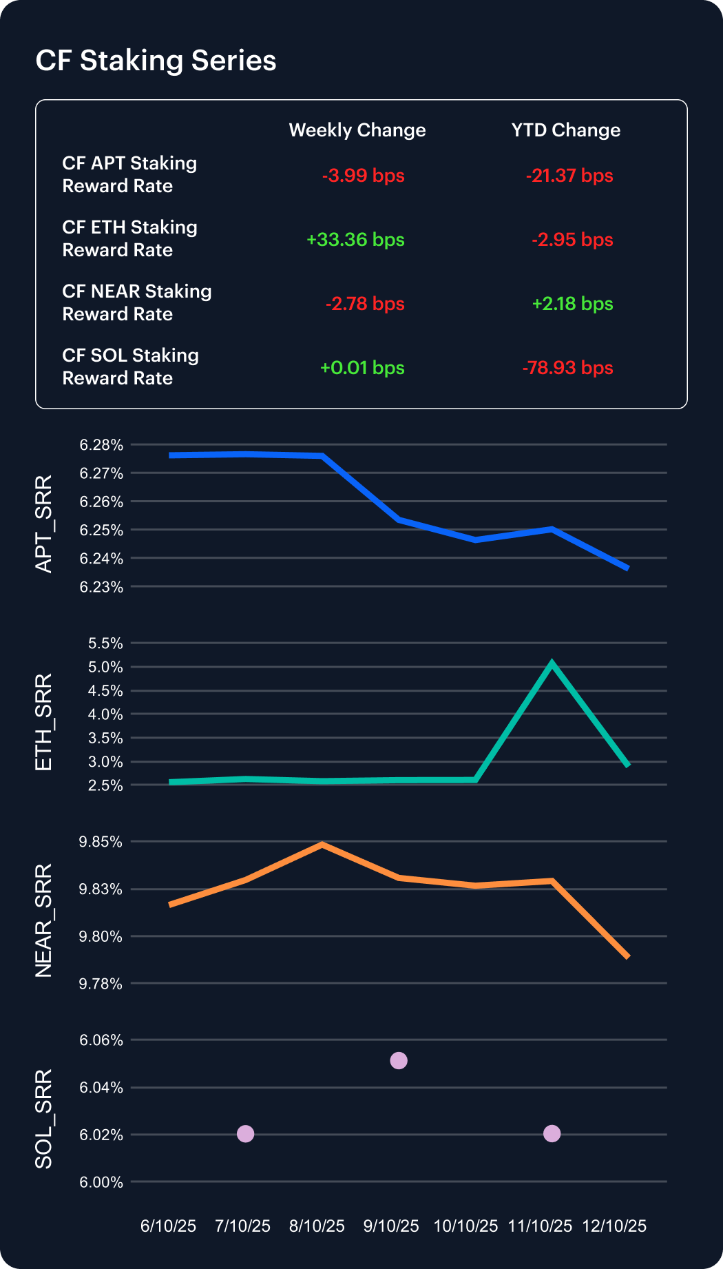 A mixed performance pattern emerged among our CF Staking Series indices amid last week’s episode of market turmoil. ETH staking rose +13.03%, with a +33.36 bps reward-rate change, while SOL staking was essentially flat, rising just +0.01 bps. By contrast, APT staking slipped −0.64% (−3.99 bps) and NEAR edged −0.28% (−2.78 bps). Potential causality is difficult to interpret, though net-net, carry conditions improved in ETH, were unchanged in SOL, and softened modestly in APT and NEAR.