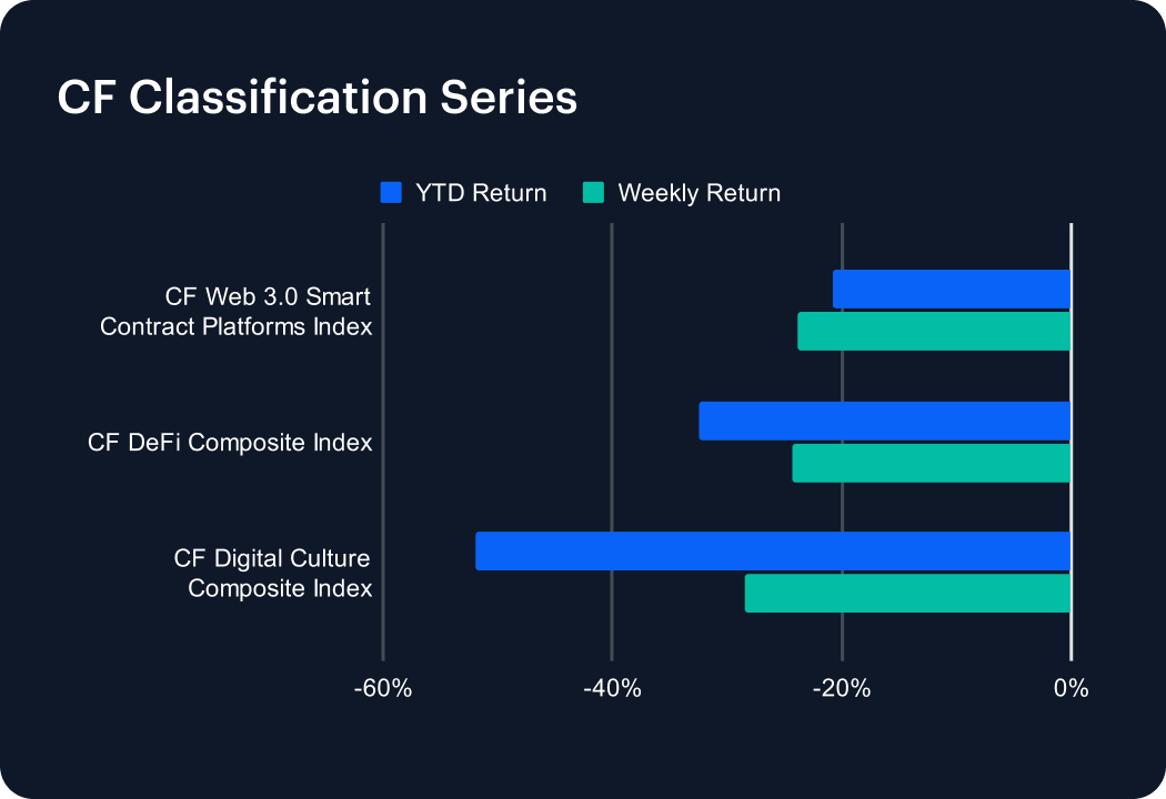 CF Benchmarks’ thematic-type indices, chiefly structured within our CF Classification Series, also broadly weakened week-on-week. CF Web 3.0 Smart Contract Platforms Index declined −23.89%, along with the CF DeFi Composite Index −24.33%, and CF Digital Culture Composite Index, −28.45%. The retreat of roughly uniform breadth depicts smart contract platform gauges and DeFi slipping in-line, with Culture trailing even those, somewhat. It’s a profile typical of risk-off phases where utility and attention-grabbing cohorts both compress; this is, lightly, a hint at indiscriminate selling creeping in.