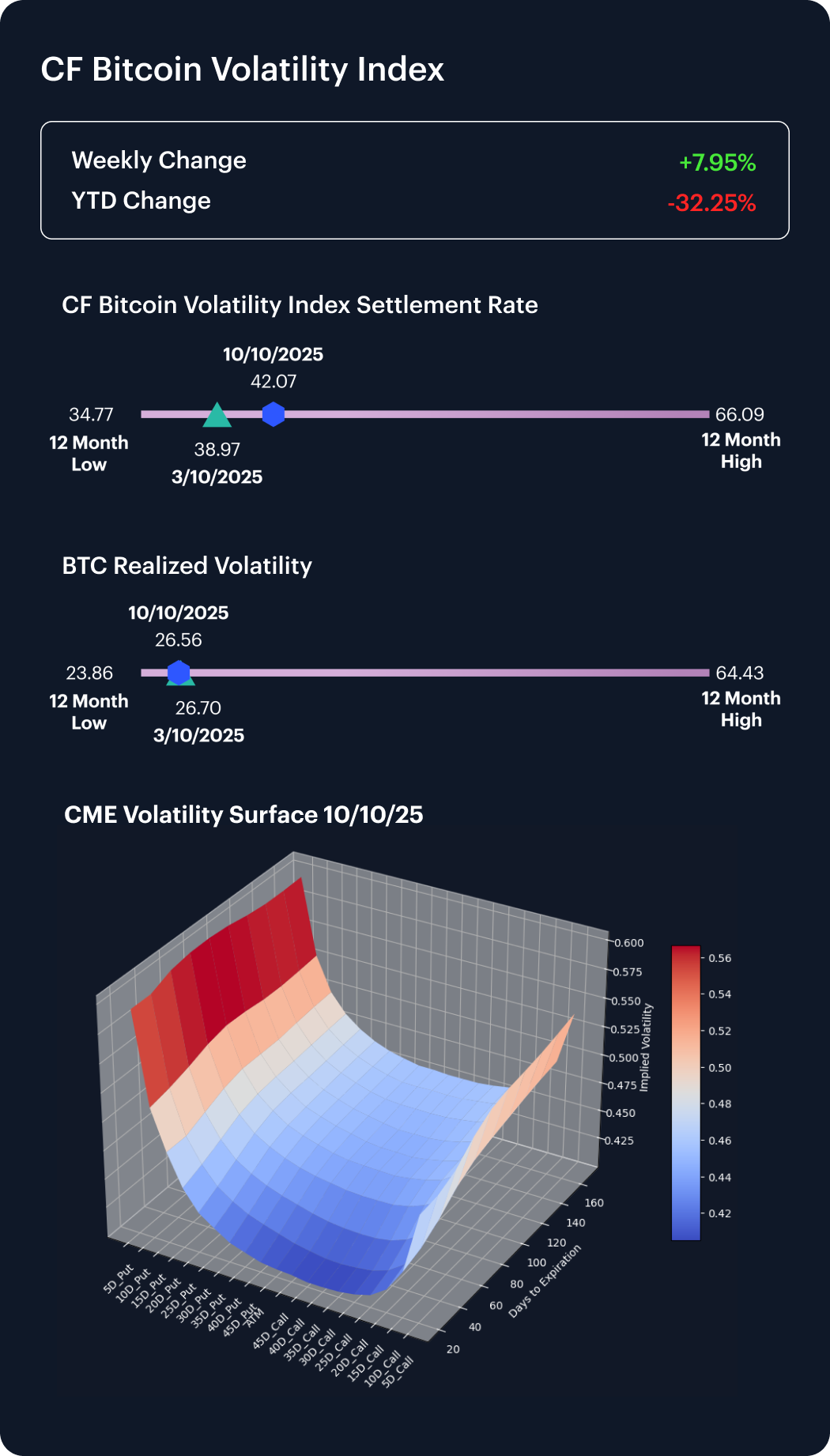 Bitcoin implied volatility vs. realized volatility diverged during the week. Our CF Bitcoin Volatility Index Settlement Rate (BVX) rose +3.10 points to 42.07, while realized eased −0.15 pts to 26.56. This widened the implied-realized gap by around +3.24 pts. The up-shift in implied alongside softer realized suggests hedging premia were rebuilt faster than delivered vol. Tentatively, this looks consistent with a sharp correlation-heavy sell-off, that could be pricing-in further medium-term downside risk.