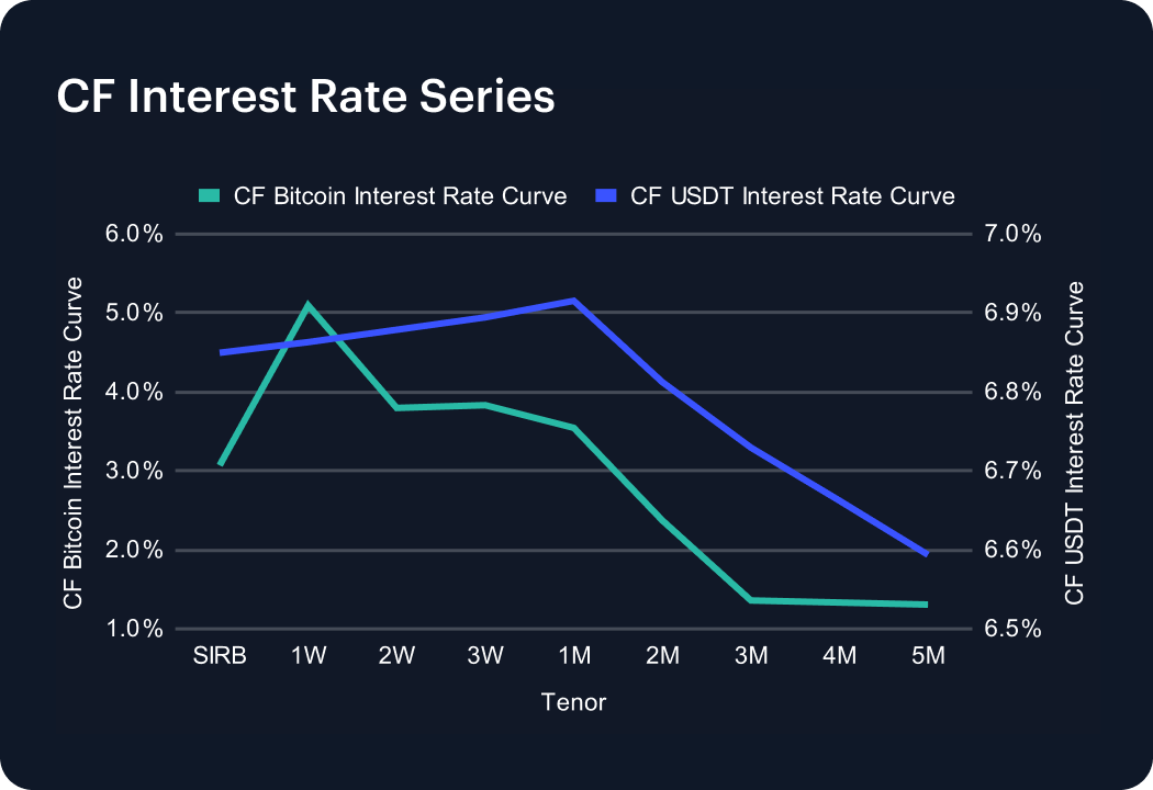 Funding curves firmed, with potential for a lag, relative to the later-week volatility, looking at how our CF Bitcoin Interest Rate Curve (BIRC) performed. On the Bitcoin side, SIRB gained +4.35 bps to 3.07%, and 1M rose +29.06 bps to 3.54%: this indicates tighter BTC-linked funding across the front-to-belly of the curve. The USDT curve also moved higher: 1W +59.28 bps to 6.86%, 1M +62.35 bps to 6.92%. Overall, to the extent that hard takeaways are possible at all, this mix implies firmer basis on BTC tenors during the week, alongside dearer dollar-stablecoin carry.