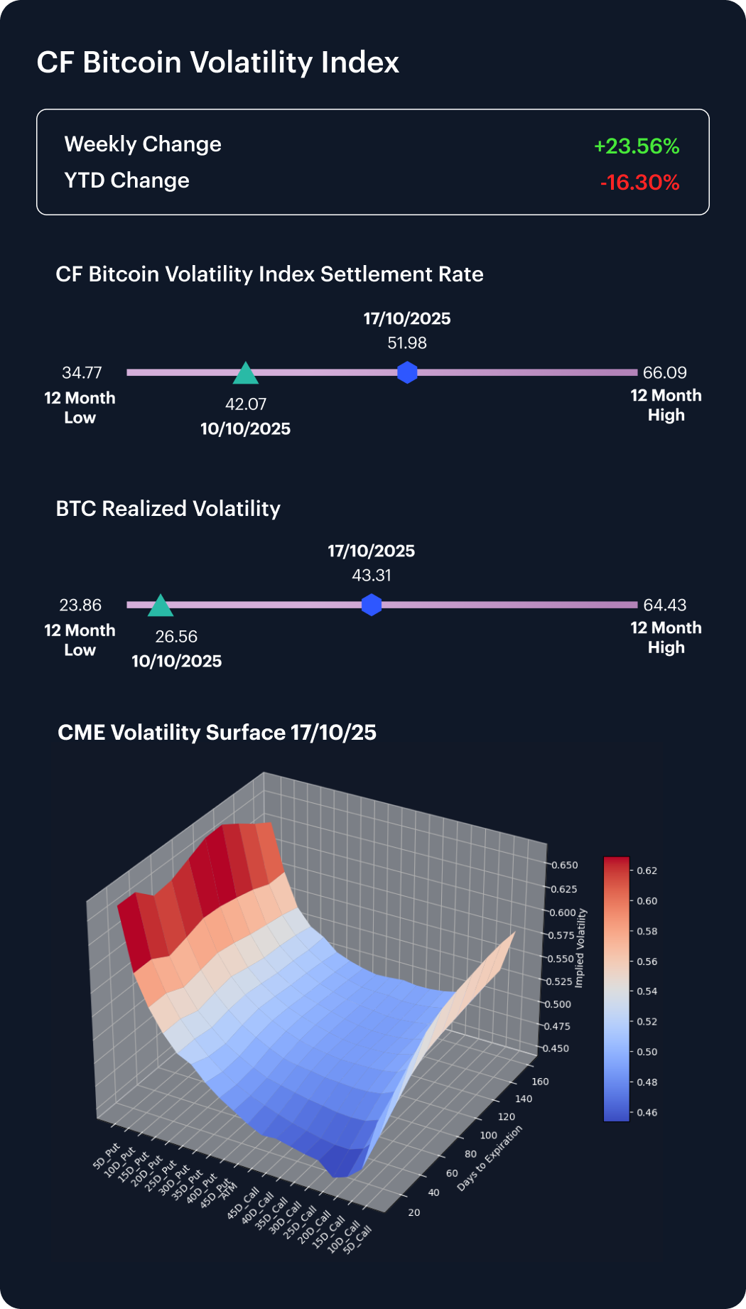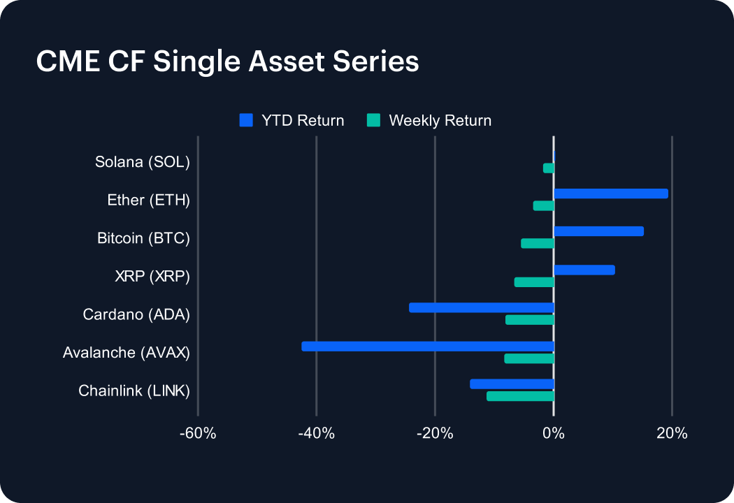 Mega caps posted another definitive week of significant losses, as early-October momentum unwound anew. Bitcoin relapsed −5.59%, Ether reversed −3.39%, and Solana lost −1.83 %. Lower-tier majors compounded the overall impression of collapse across the CME CF Single Asset view of high-profile, high-capitalization tokens: XRP slid −6.62%, Cardano (ADA) −8.16%, Avalanche (AVAX) −8.34%, and Chainlink (LINK) fell hard, −11.24%. Nevertheless, the tone still qualifies as corrective rather than disorderly, with breadth fading perceptibly, amid a rotation back toward relative defensives. Year-to-date performance remains positive for BTC (+15.23%) and ETH (+19.39%) but negative across the remainder of the cohort.