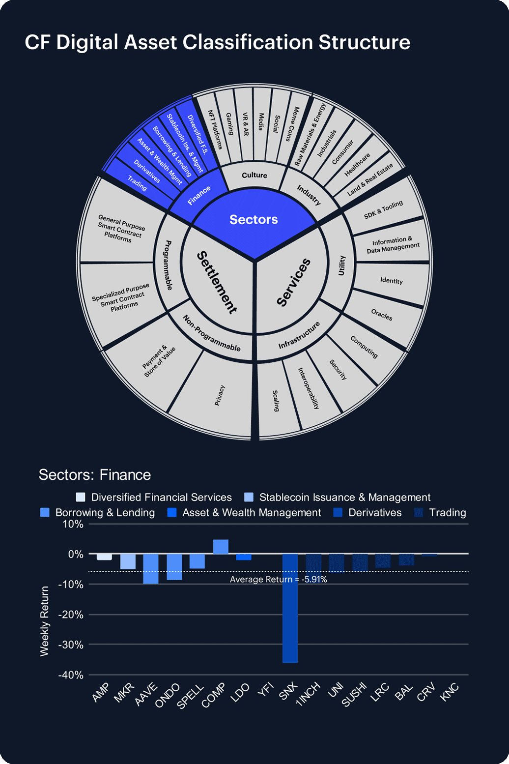 Through the CF Digital Asset Classification Structure (CF DACS) lens, sector performance was sharply negative week-on-week, with only isolated pockets of strength. In Finance, Borrowing & Lending posted a lone material gain via COMP +4.83%, while Derivatives led declines (SNX −36.03%). Trading also fell, e.g., UNI −6.43%, 1INCH −9.64%; alongside Stablecoin Issuance & Management (MKR −5.04%). In Services, the Computing Segment was hit hard (FET −26.32%, HNT −12.55%, RENDER −9.16%). Similar weakness followed across the following Segments: Oracles (LINK −11.24%), Interoperability (ZRO −12.67%, QNT −8.39%), and Scaling (STRK −13.41%, OP −8.05%). In Settlement, the worst-hit General Purpose Smart Contract Platforms tokens were: APT −14.00%, NEAR −10.28%, and ICP −11.03%. For Culture, both Gaming and Meme Coins lagged most: e.g., IMX −8.88%, SUPER −10.43%; and RARI −15.97%. Dispersion was wide, but the profile remained orderly, consistent with de-risking rather than disorder.