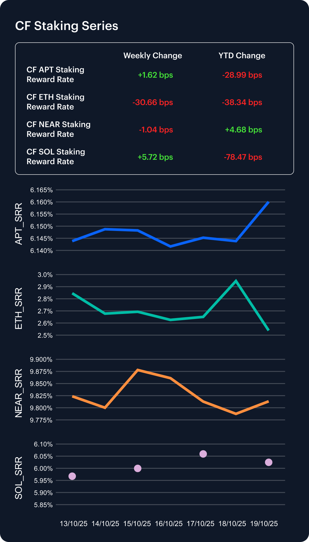 Staking indices diverged week-on-week. APT edged higher, +0.26% (+1.62 bps reward-rate), and SOL staking too, +0.96% (+5.72 bps), while NEAR staking weakened: −0.11% (−1.04 bps) and ETH staking exhibited the strongest chill with a −10.77% decline (−30.66 bps). Moves seem to reflect index-level staking carry and reward-rate shifts, rather than spot returns. The net picture is mixed, with ETH showing the clearest weekly compression in carry.