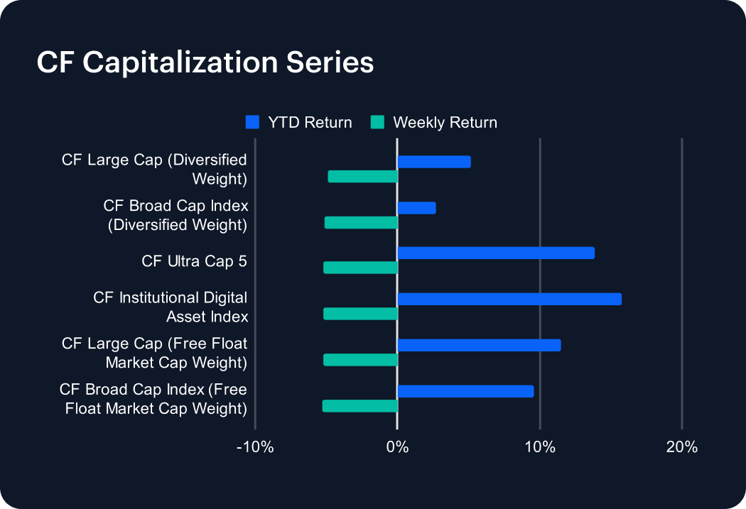 Week-on-week falls across size tiers were synchronous with banner returns across the space. CF Broad Cap Index (Diversified Weight) slid −5.16%, CF Large Cap (Diversified Weight) −4.92%, CF Ultra Cap 5 −5.22%, and CF Institutional Digital Asset Index −5.23%. The free-float variants declines were as follows: CF Broad Cap Index (Free Float Market Cap Weight) −5.31%, and CF Large Cap (Free Float Market Cap Weight) −5.23%.