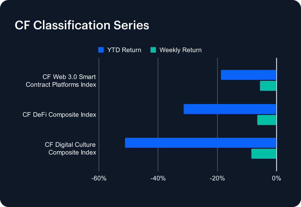 Thematics weakened in-kind. CF Web 3.0 Smart Contract Platforms Index was down −5.56%, CF DeFi Composite Index −6.47%, and, reflecting a relatively deeper loss of favor in this group, the CF Digital Culture Composite Index lost −8.47%. This mirrors prior de-risking phases in which utility-weighted sectors hold up better than attention-driven themes. Year-to-date losses deepened marginally, leaving classification indices trailing capitalization composites.