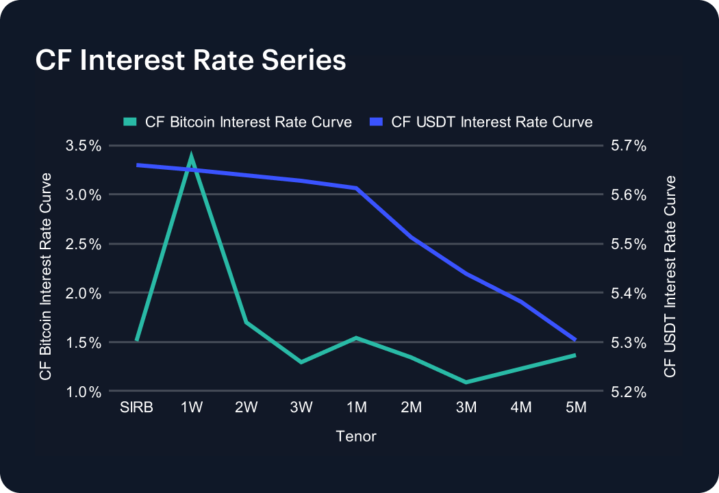 Week-on-week, both curves fell across the strip. Bitcoin’s short-term SIRB printed at 1.51% (from 3.07%, −1.56 pp), while 1-Month moved to 1.54% from 3.54%, −2.00 pp. On the USDT side, 1-Week eased to 5.65% from 6.86%, −1.21 pp; and 1-Month to 5.61% from 6.92%, −1.31 pp. Bitcoin’s term structure thereby remains shallow with pronounced front-end compression versus the prior week; USDT’s slopes modestly downward from 1W through 5M. The read-through is steady BTC funding at the very front, with softer term premia beyond 1W, while USDT carry is gradually lower across the curve.