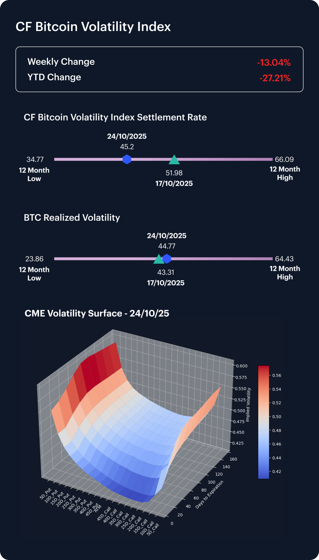 Volatility moderated further in the recently completed week. The CF Bitcoin Volatility Index (BVX) declined from its close on Friday October 17th, at 51.98 to 45.20 (−13.04%), while realized volatility edged up slightly to 44.77 from 43.31 (+1.46 pts). With implied falling faster than realized, the implied–realized gap narrowed, signaling reduced hedging demand, and a return to measured two-way trading. Current BVX levels remain above the 12-month low (34.77) but comfortably below the 12-month high (66.09), leaving the volatility surface firm yet orderly — a hallmark of range-bound consolidation.