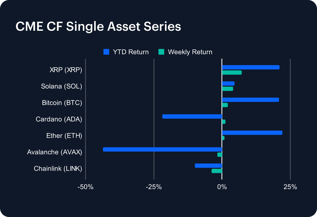 Large-caps have clawed back some ground after two weeks of losses, marking a steadier close to October. Within the CME CF Single Asset Series, XRP (XRP) led with a +7.29% gain in the most recent week, leaving the token with a +21.02% year-to-date return; followed by Solana (SOL) +4.01% (YTD +4.59%) and Bitcoin (BTC) +2.17% (YTD +20.82%). Cardano (ADA) and Ether (ETH) also advanced, +1.33% and +0.88%, consolidating mid-month support. Among assets less favored, Avalanche (AVAX) continued lower, losing −1.78%, and Chainlink (LINK) tanked further −3.79%. The rotation back toward higher-liquidity majors leaves breadth constructive, though participation remains uneven. Overall, we saw what looked like a corrective rally over the week, rather than renewed ‘risk-on’.