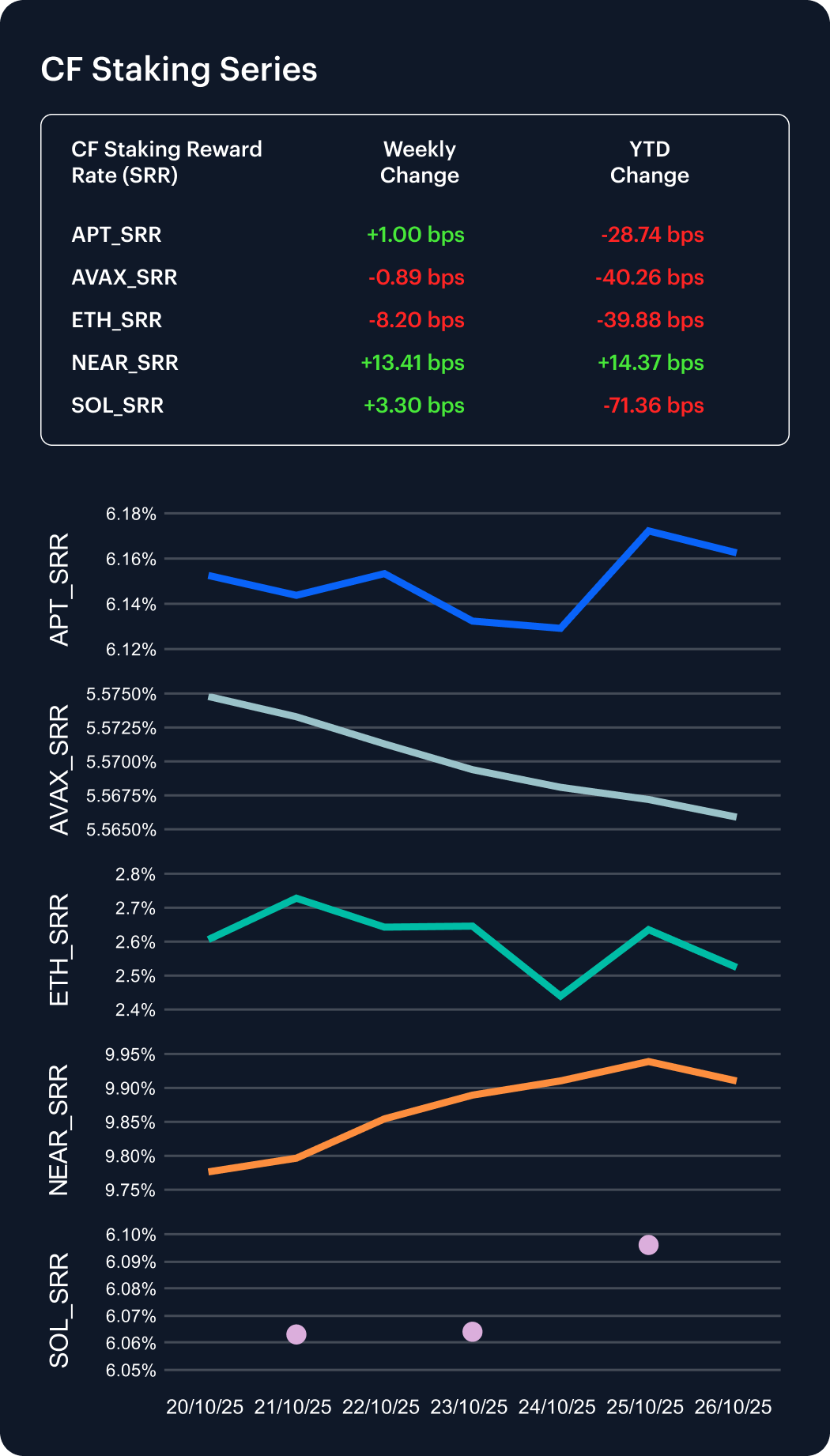 Staking indices were once again mixed week-on-week. APT staking edged slightly higher, +0.16% (+1.00 bps); AVAX staking edged slightly lower, −0.16% (−0.89 bps). SOL gained a little more, +0.54% (+3.30 bps), and NEAR gained +1.37% (+13.41 bps). Meanwhile, ETH staking was the laggard, with a definitive decline, −3.15% (−8.20 bps). Year-to-date readings stand as follows: APT −4.46% (−28.74 bps), AVAX −6.75% (−40.26 bps), ETH −13.64% (−39.88 bps), NEAR +1.47% (+14.37 bps), SOL −10.48% (−71.36 bps). Net read-through for the most recent week suggests carry expanded for NEAR and SOL, was flat-to-softer for APT and AVAX, and was most compressed for ETH.