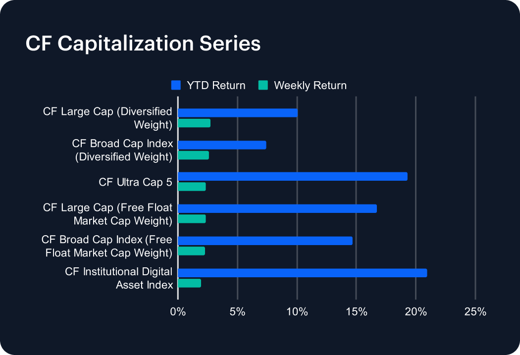 The CF Capitalization Series advanced week-on-week across all tiers, extending October’s recovery. CF Large Cap (Diversified Weight) rose +2.73% (YTD +10.08%), while CF Broad Cap Index (Diversified Weight) gained +2.58% (YTD +7.43%). CF Ultra Cap 5 climbed +2.36% (YTD +19.27%), and CF Institutional Digital Asset Index increased +1.96% (YTD +20.91%). Free-float market-cap variants moved in parallel: CF Large Cap (Free Float Market Cap Weight) +2.33% (YTD +16.74%) and CF Broad Cap Index (Free Float Market Cap Weight) +2.29% (YTD +14.67%). The uniformity of gains underscores systematic inflows across capitalization tiers and renewed liquidity concentration among the highest-weighted constituents.