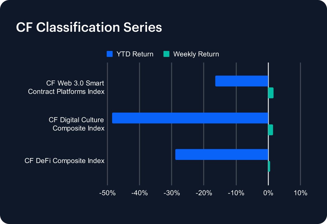 The CF Classification Series advanced modestly week-on-week. CF Web 3.0 Smart Contract Platforms Index gained +1.57% (YTD −16.51%), CF Digital Culture Composite Index rose +1.42% (YTD −48.61%), and CF DeFi Composite Index added +0.61% (YTD −28.97%). The rebound was led by Smart-Contract Platforms and Culture, while DeFi lagged slightly. The pattern echoes prior recovery phases, where utility-oriented themes stabilize first, followed by slower rotation into liquidity-sensitive cohorts.