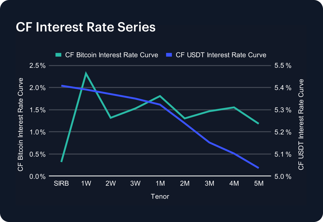Crypto funding conditions eased week-on-week, looking at our proprietary Bitcoin and USDT curves. The CF Bitcoin Interest Rate Curve (BIRC) printed SIRB at 0.32%, 1W 2.32%, 2W 1.32%, 3W 1.53%, and 1M 1.81%, with tenors beyond 1-month steady between 1.18–1.55%. The CF USDT Interest Rate Curve remained elevated but slightly compressed: SIRB was at 5.41%, 1W at 5.39%, and 1M at 5.32%; tapering to 5.04% at 5M. The shape of both curves is flat-to-mildly downward-sloping, reflecting restrained leverage and steady front-end funding. BTC’s front remains anchored, while USDT carry shows continued softening, consistent with a calmer liquidity backdrop.
