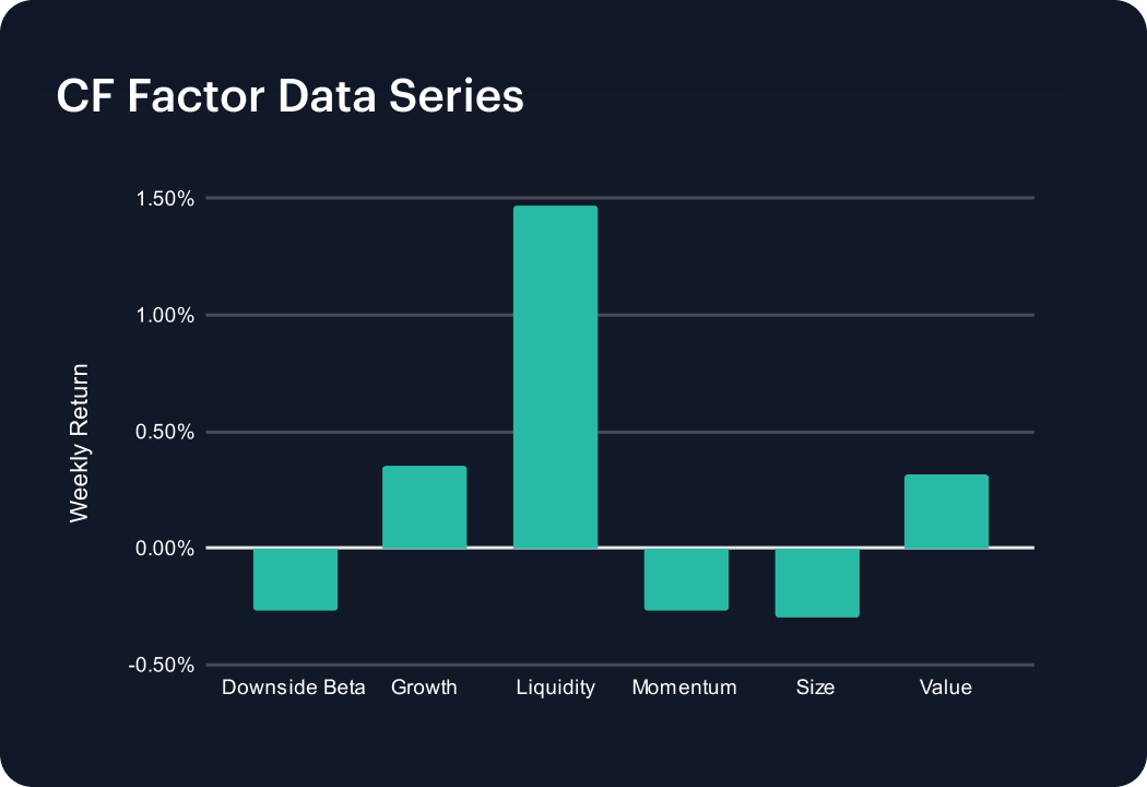 No specific 'style' stood out sharply in the most recent week, with CF Factor Intelligence data exhibiting mixed returns among our CF Benchmarks-validated Digital Asset Factors. Liquidity led with a +1.47% gain, followed by Growth +0.36%, and Value +0.32%. On the negative side, Downside Beta retreated −0.27%, Momentum, −0.27%, and Size, −0.30%. The composition indicates a rotation toward liquidity preference and quality factors, while risk-sensitive and cyclical exposures eased. Dispersion across styles narrowed versus the prior week, leaving factor breadth balanced into month-end.