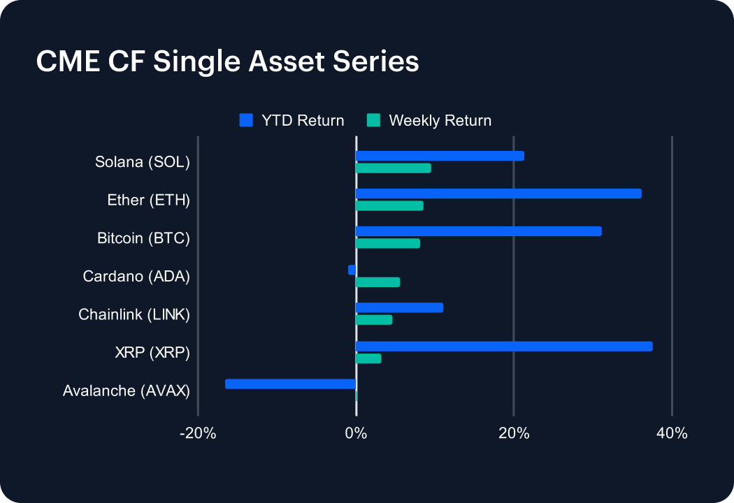 Digital assets rallied week-on-week, led by higher-beta majors. Bitcoin advanced +8.12%, Ether gained +8.55%, while Solana (SOL) rebounded +9.46%, setting the tone. Meanwhile other large caps also climbed, sealing a broad-based rally at the higher-capitalized end. Cardano (ADA) +5.53%, Chainlink (LINK) +4.58%, XRP (XRP) +3.26%. Only Avalanche (AVAX) +0.09%, lagged the move in this series. The pattern points to a risk-on bid with breadth skewed to the top end, albeit still somewhat selective moving down the capitalization strata. Follow-through into early week sessions is likely to hinge on whether flows persist beyond leaders.