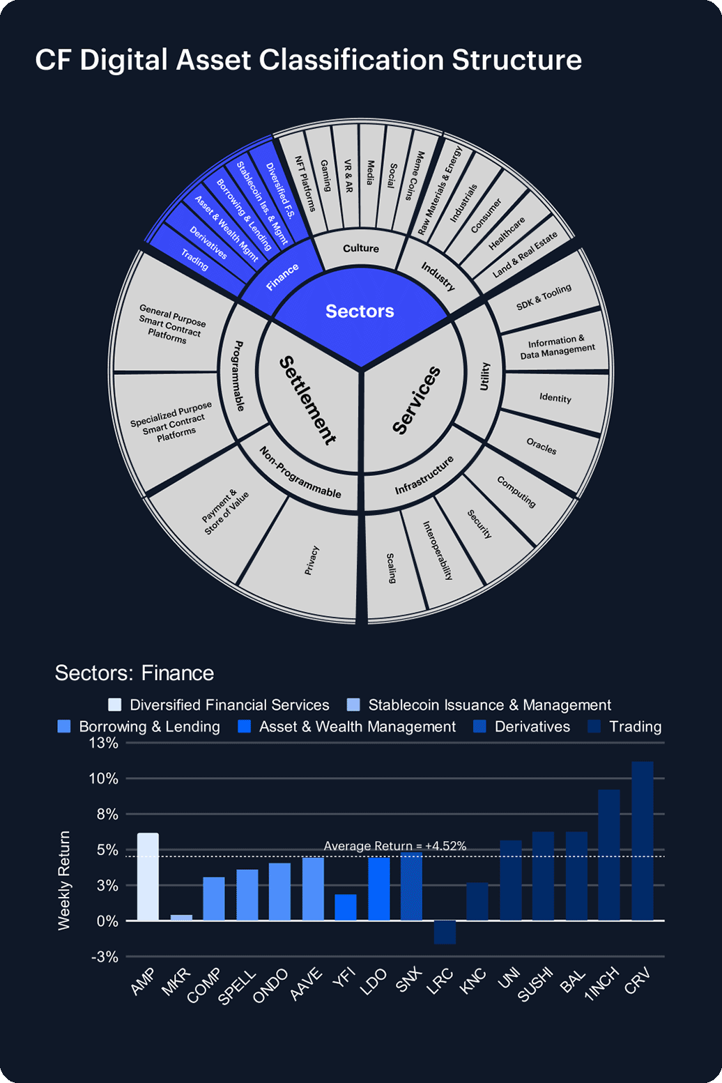 Sector performance was broadly constructive week-on-week, with dispersion contained and no discernibly outsized rotations - looking through our CF Digital Asset Classification Structure (CF DACS) prism. Leadership appeared balanced across core Infrastructure and Services cohorts, consistent with a market biased to liquidity and transactional activity rather than narrow, attention-led themes. In short, this was a “beta first” week; with little disruption to ‘style’ narratives, and sector breadth improved versus recent de-risking phases. Standouts included: the Payment & Store of Value Segment (within the Settlement category) +12.5% week-on-week, the Culture Sub-Category’s Gaming segment, +8.2% w/w, Scaling (an Infrastructure Sub-Category) +4.6% w/w, and Meme Coins in Culture +3.5% w/w.
