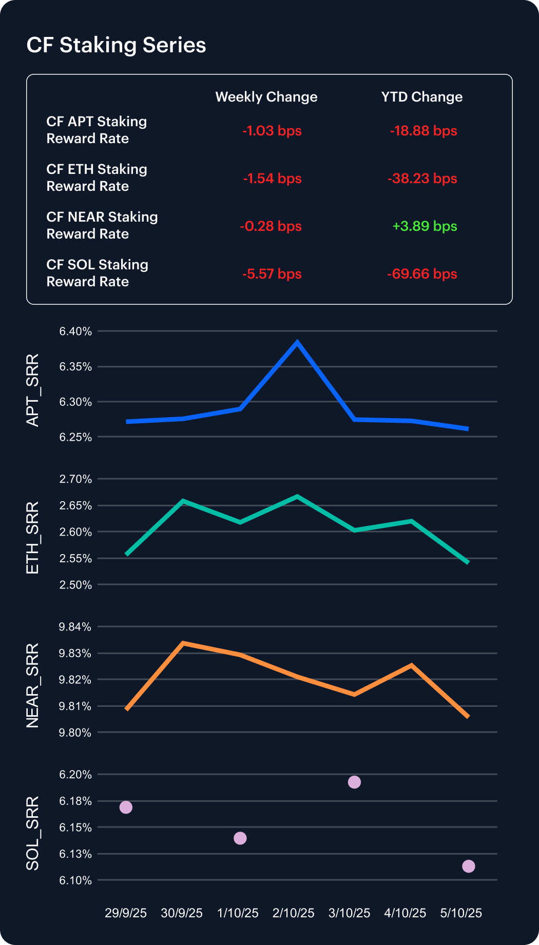 Staking indices were softer week-on-week even as spot rallied: APT staking edged −0.16% lower, equating to a −1.03 bps reward-rate move. ETH staking retreated −0.60%, or −1.54 bps, while NEAR was almost static, ticking down −0.03% (−0.28 bps). Meanwhile, SOL staking showed the most definitive reversal, falling −5.57 bps, or −0.90%. The slight drift lower in reward rates points to a marginal easing in staking carry, week-on-week, with SOL bearing the brunt.