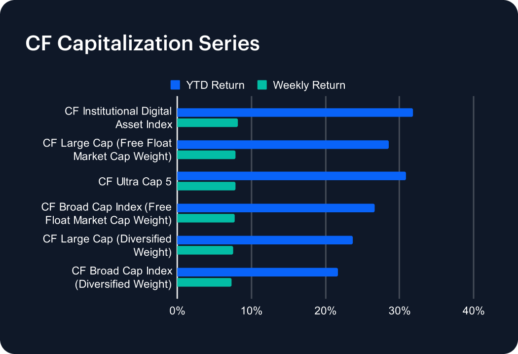 Moves were orderly across size tiers week-on-week. The CF Broad Cap Index (Diversified Weight) advanced +7.34%, CF Large Cap (Diversified Weight) gained +7.53%, CF Ultra Cap 5 rose +7.87%, and the CF Institutional Digital Asset Index climbed +8.19%. The rank order suggests buyers prioritized depth and liquidity, reflected by Ultra Cap and Large Cap edging Broad Cap for the week. That pattern is consistent with systematic and benchmark-aware inflows.