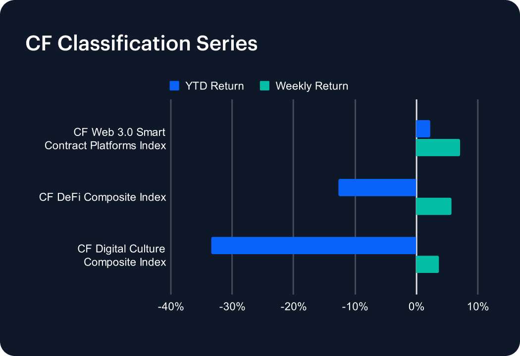 Thematics firmed week-on-week. The CF Web 3.0 Smart Contract Platforms Index rose +7.16%, the CF DeFi Composite Index gained +5.67%, and the CF Digital Culture Composite Index added +3.68%. The rebound was led by platforms and DeFi, with Culture participating but trailing; a profile typical of up-weeks where utility and liquidity screens draw incremental demand. Momentum improved versus the prior de-risking stretch, though leadership remains concentrated in higher-quality constituents.