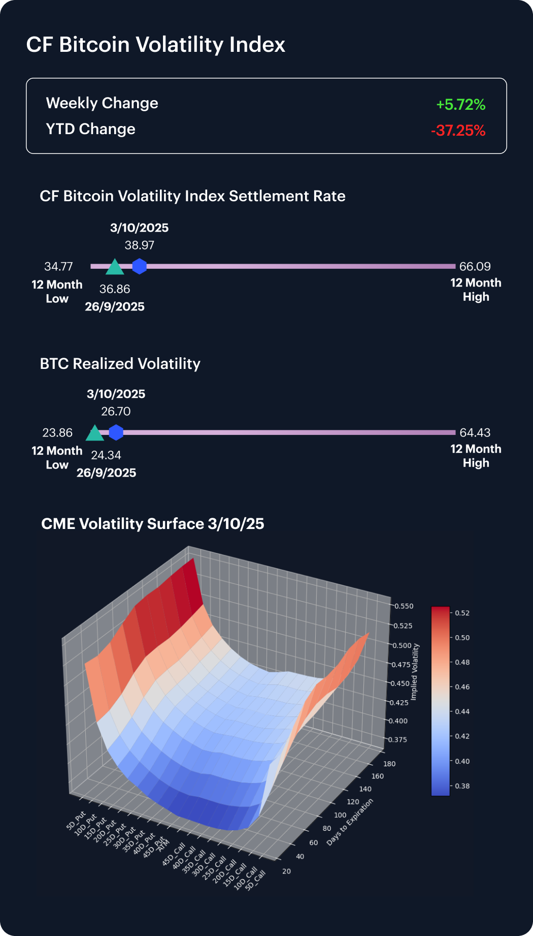 Digital assets rose, led by mega caps: Bitcoin +8.1%, ETH +8.6%, Solana +10%. CF Web 3.0 Smart Contract Platforms Index +7.2% and DeFi +5.7% showed renewed sentiment. Staking eased. BVX tracked higher Bitcoin implied and realized volatility, while BTC funding tightened slightly.
