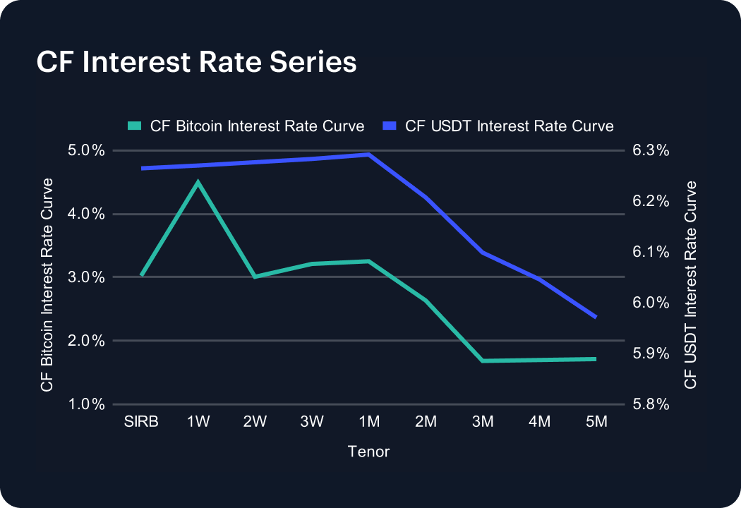 Funding curves diverged week-on-week. On the Bitcoin side, SIRB firmed with a +2.28-percentage point gain to 3.03%, while 1M rose +1.60 pp to 3.25%, pointing to tighter BTC-linked funding. By contrast, the USDT curve eased, with 1W contracting from 8.66% to 6.27% (−2.39 pp) and 1M from 8.69% to 6.29% (−2.40 pp). This mix implies improving basis on BTC tenors even as dollar-stablecoin carry compresses at the front and belly of the curve, week-on-week.